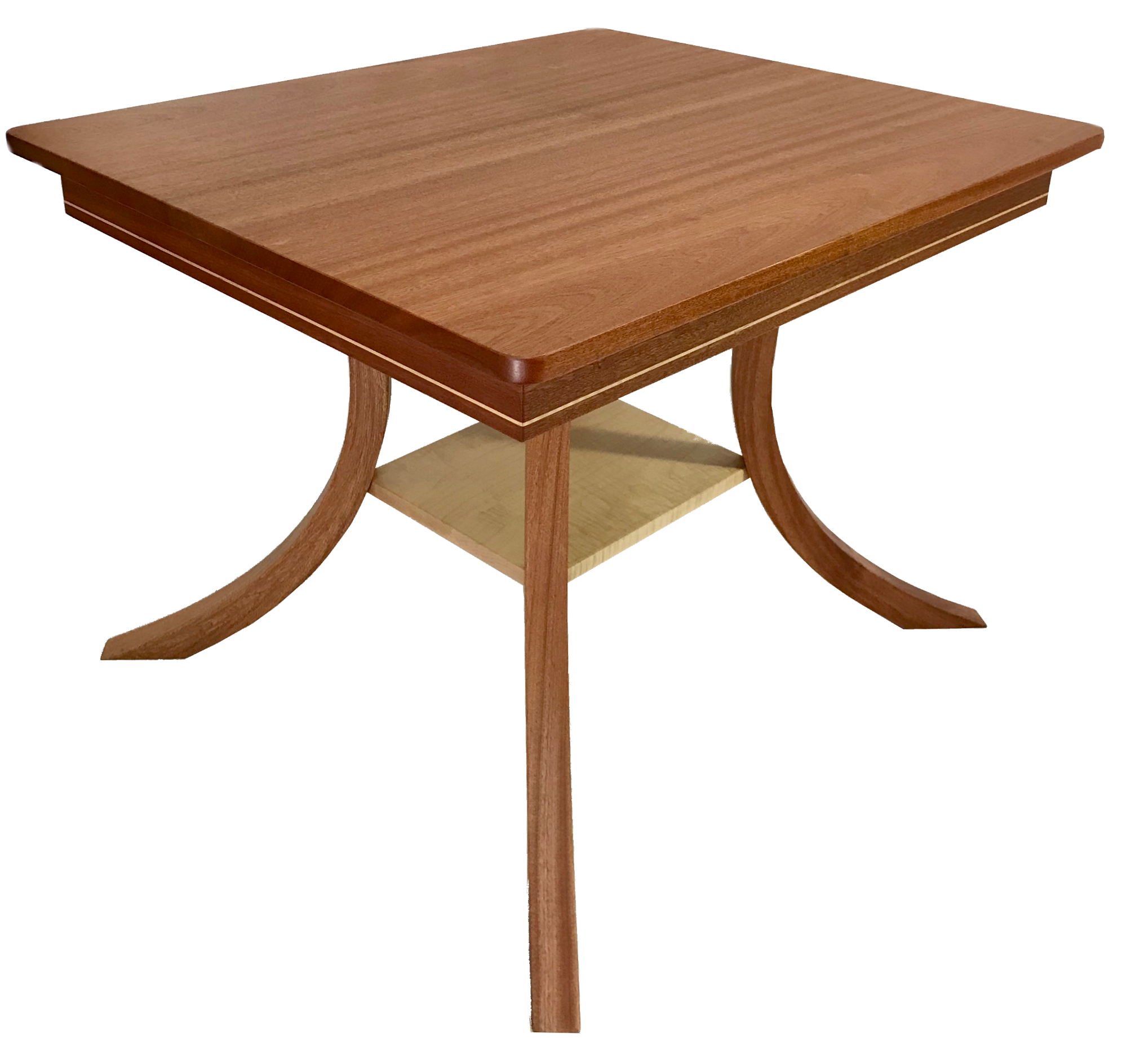 The table is made from sapele, an African hardwood, and curly maple. The legs make this table standout. They were created using a process called bent lamination. Bent lamination involves taking a piece of wood and slicing it into smaller strips of wood. These strips are sequenced and re-glued using a form. The end product leaves indistinguishable glue lines and maximizes the control of how each piece is bent.