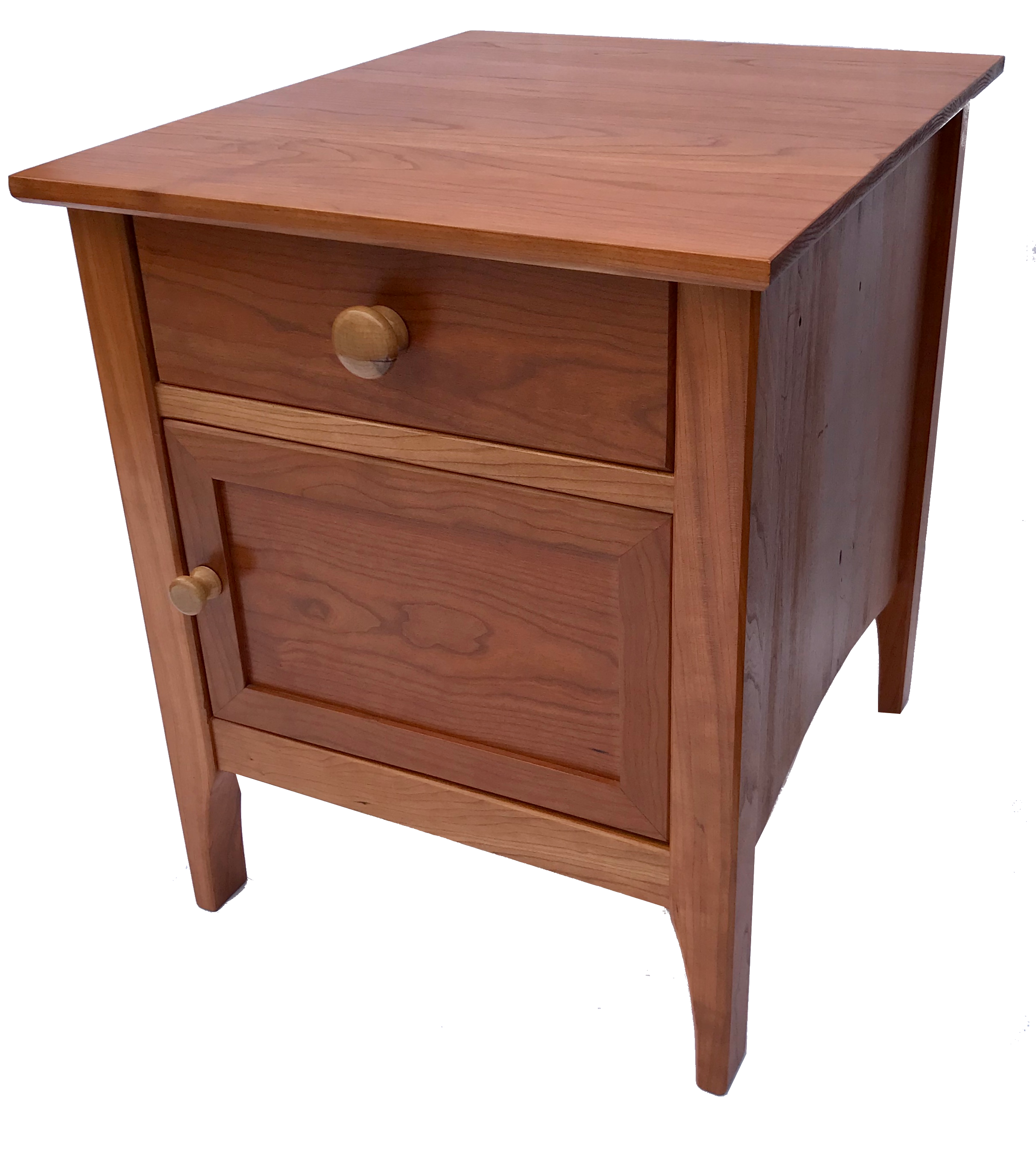 This shaker table, made from cherry wood, is designed to provide ample storage. It features a well-sized dovetailed drawer, while the compartment behind the door is perfect for storing extra blankets. The drawer knobs, turned from maple, create a nice contrast with the darker cherry wood. The cabinet is constructed using mortise and tenon joinery throughout. True to the shaker style, it includes a simple frame and panel door.