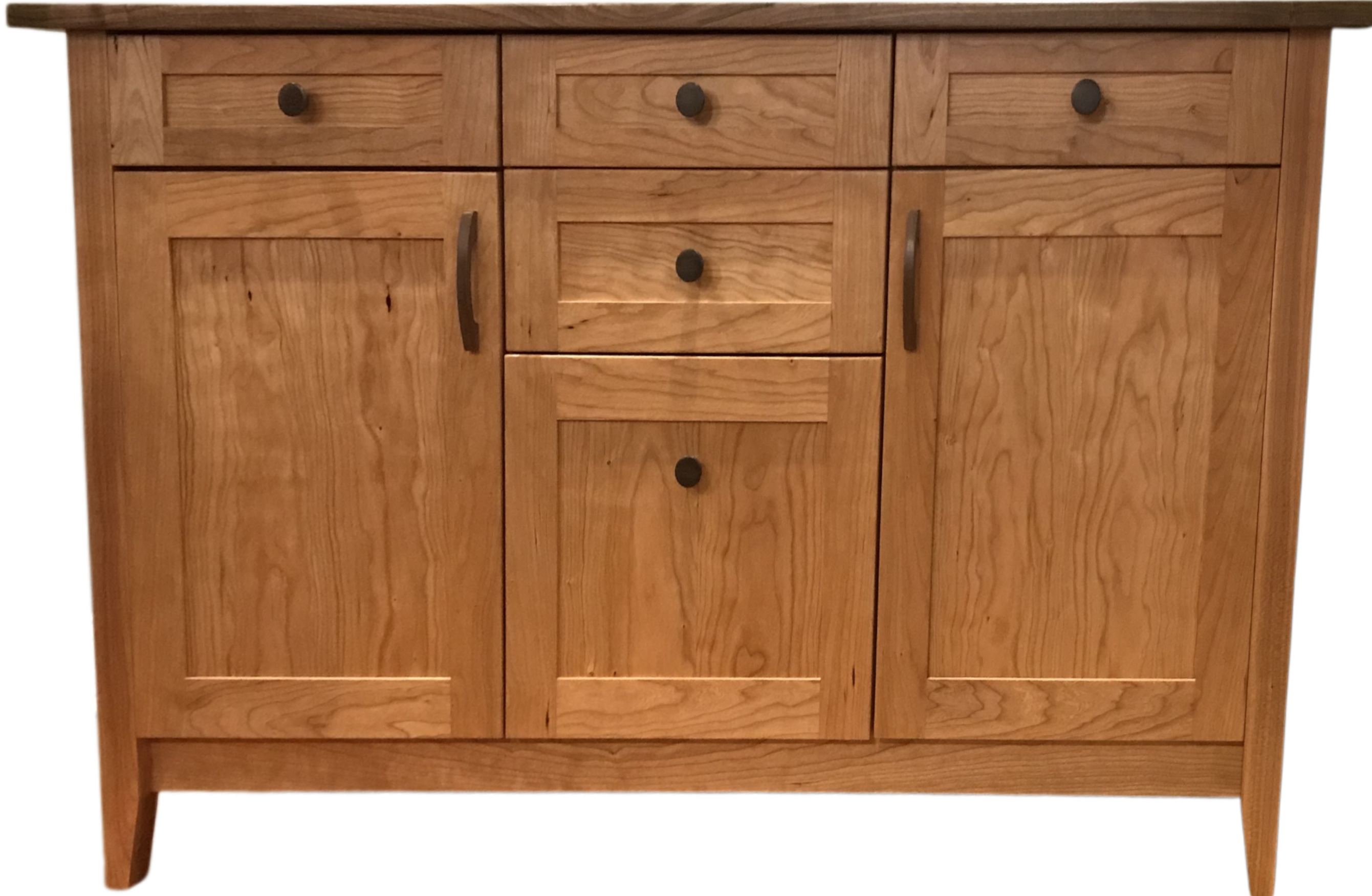 This is one of the heaviest pieces of furniture I have made to date. This cabinet was designed to store bottles of wine, liquor, and glassware while still providing ample additional storage space. It is built in a shaker style with frame-and-panel construction throughout. The drawers feature heavy-duty undermount slides, and once the doors are opened, there are pull-out drawers for extra convenience. The main body of the cabinet is constructed from solid cherry wood, while the top is a butcher block made of walnut. I also made the drawer and door pulls specifically for this piece.